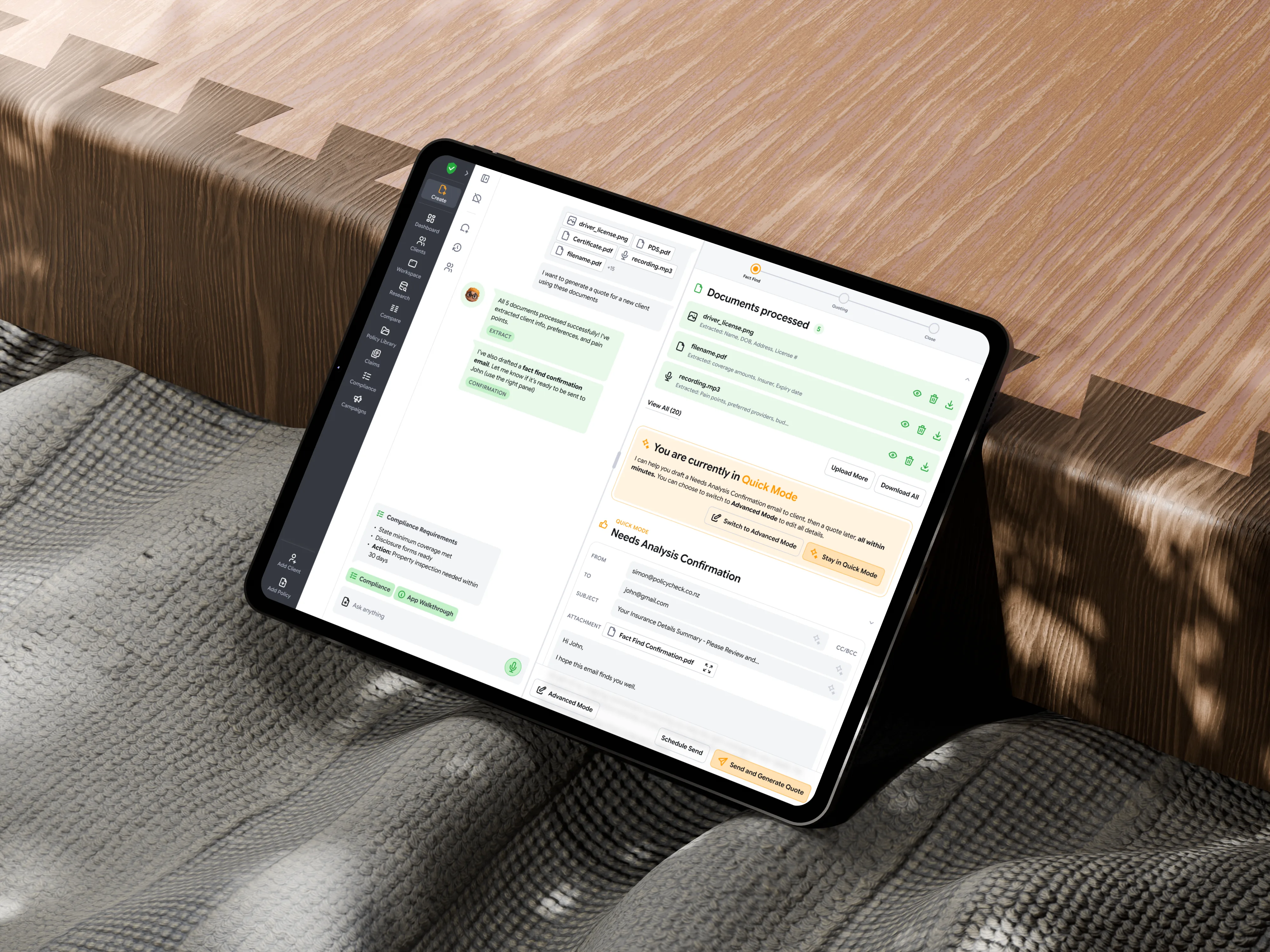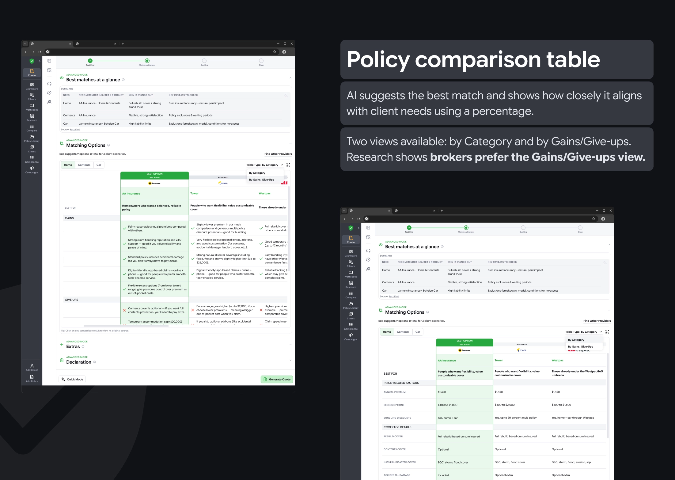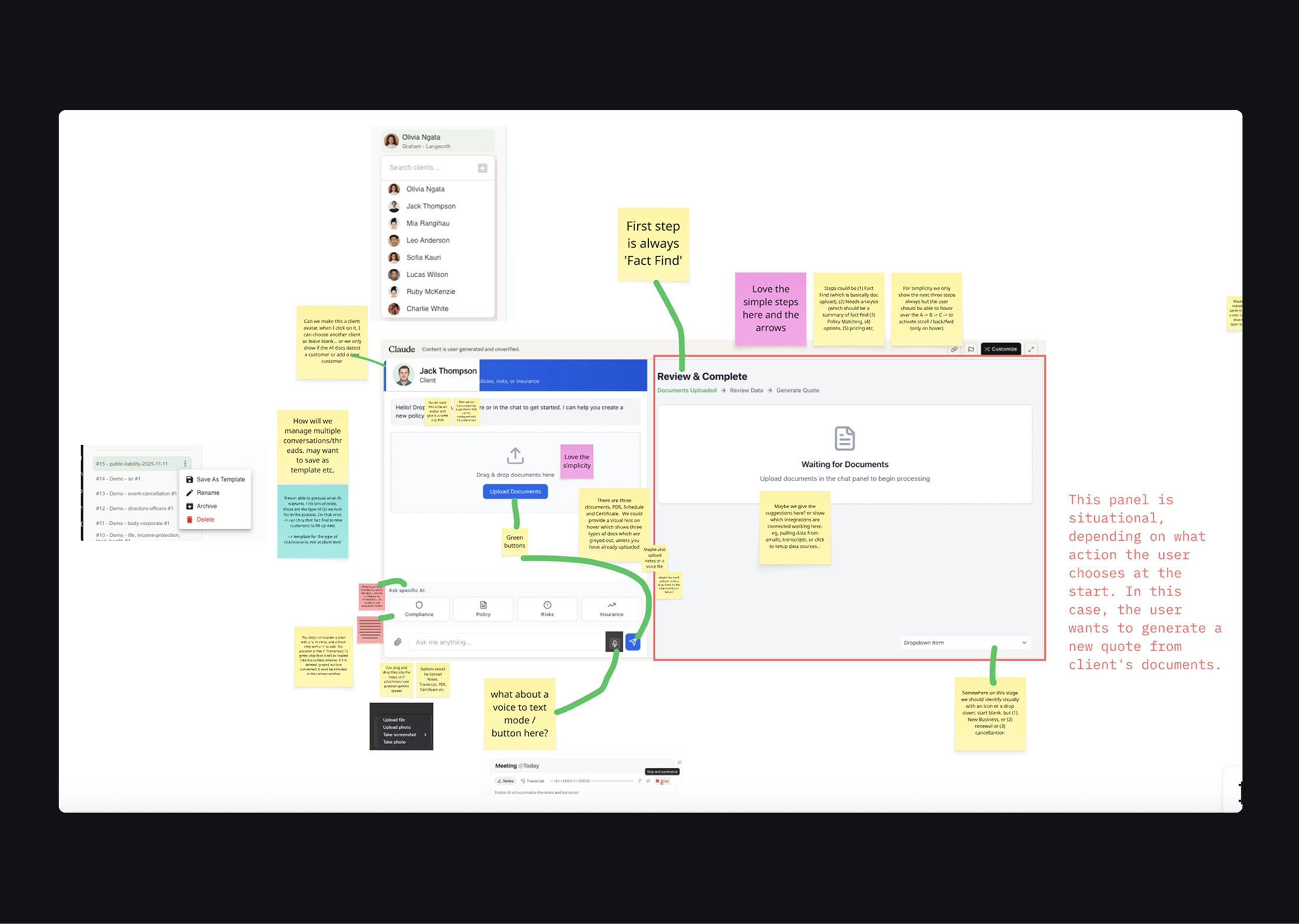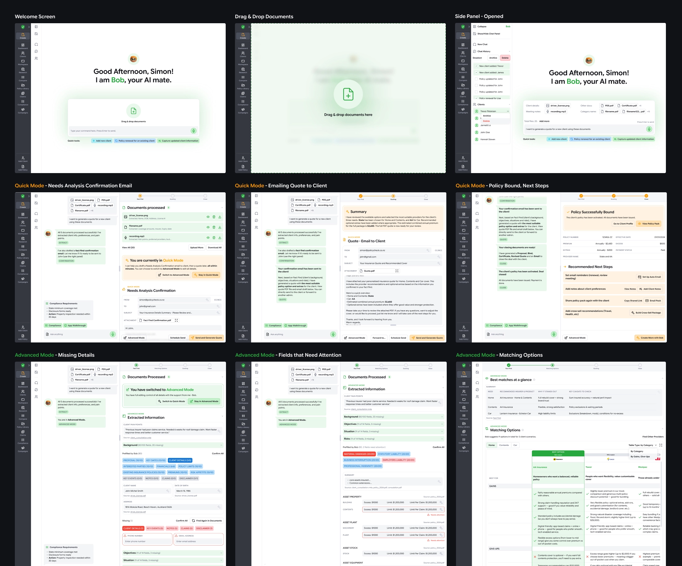 To support that mission, PolicyCheck created Create: an AI assistant built specifically for brokers and advisers. Like ChatGPT, Gemini, or Claude, it helps users work faster and with less friction, but it is grounded in real policy logic and day-to-day advisory workflows. I was brought in to revamp the end-to-end user experience, working closely with our project manager and input from consultants and investors.