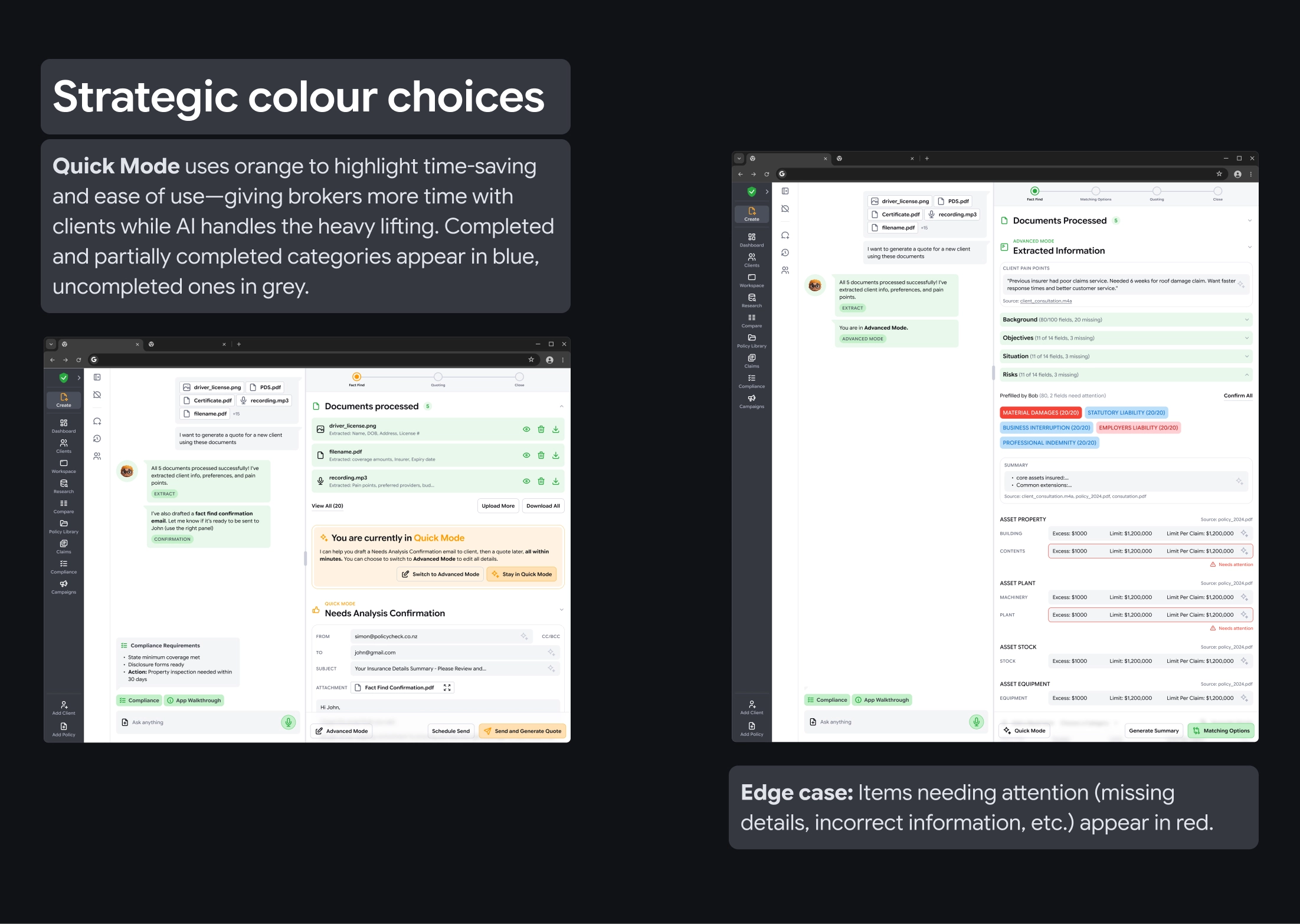 I focused on multi-stage empathy, understanding how brokers build trust, educate clients, and make confident recommendations while operating under heavy compliance pressure.